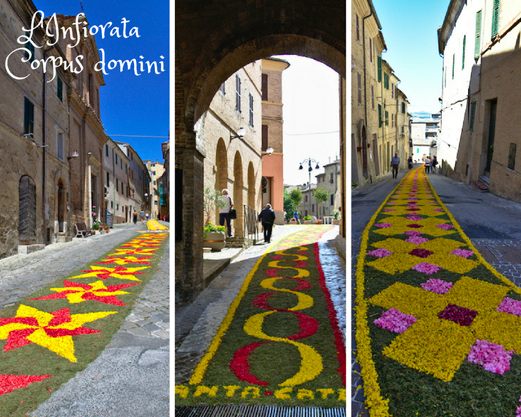 In deze kleine gemeente in het hart van de groene heuvels van Le Marche, begint de voorbereiding van de viering weken of zelfs maanden eerder, en van de jongste tot de oudste bewoner doet eraan mee.. Het begint allemaal met de leerlingen van de plaatselijke middelbare school die onder het geschoolde oog van de lerares kunstgeschiedenis Rita Uncini de motieven schetsen die kunnen worden gekozen voor de bloementapijten.