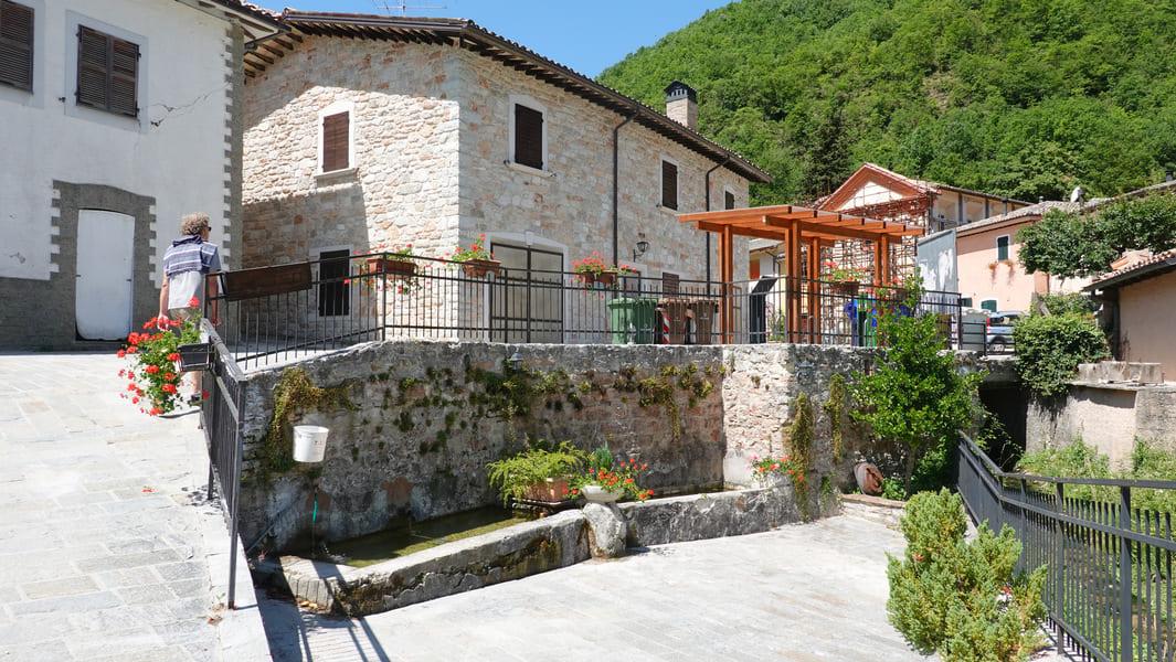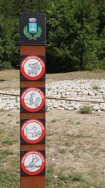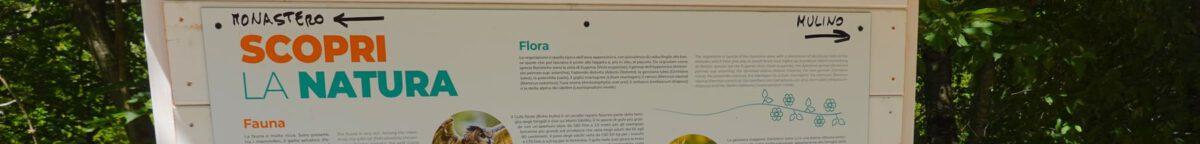 Bij de Romeinse brug staat een bord met uitleg over de fauna en flora. Bovenaan schreef men links naar de eremo ( een kluizenaarskerk uit de 12 de eeuw die sinds de aardbeving van 2016 nog niet toegankelijk is) Rechts gaat het naar de molen.