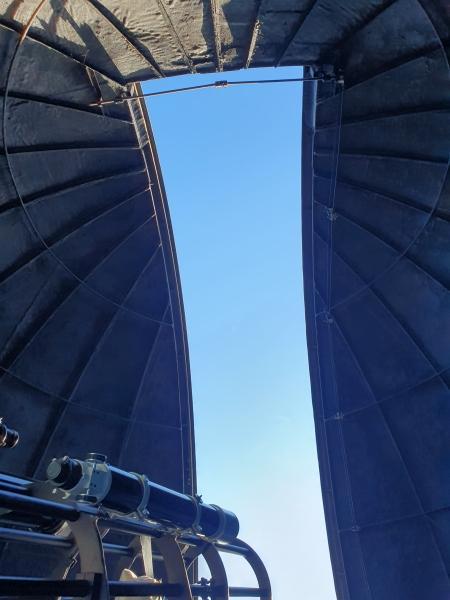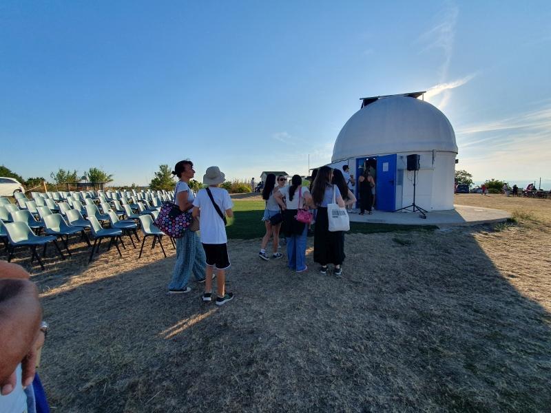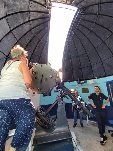 We mochten één voor één naar binnen terwijl het nog daglicht was en een blik werpen door de telescoop naar een sterrenbeeld van Saturnus en de Zon, dat op dat moment bijzonder goed zichtbaar zou moeten zijn. Eerlijk gezegd kon ik niet echt iets zien. Maar ik vond de binnenkant van de sterrenwacht wel fascinerend, en hoe je een ladder moest beklimmen om überhaupt bij de telescoop te komen.