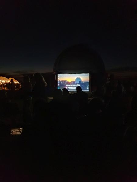 Ook de sterrenwacht stond inmiddels in het donker, maar er stonden een scherm en stoelen voor. We namen er plaats en wachtten af wat er zou gebeuren. En wachtten. En wachtten. Eerst werden er verschillende afbeeldingen van sterren en andere hemellichamen op het scherm getoond. Daarna legde een lid van de sterrenwachtclub ons de hemel uit: de sterrenbeelden die we konden zien, inclusief hun namen en de geschiedenis van hun namen. Dit gaf ons tegelijkertijd een introductie in de Griekse en Romeinse mythologie, van Cassiopeia tot Orion.