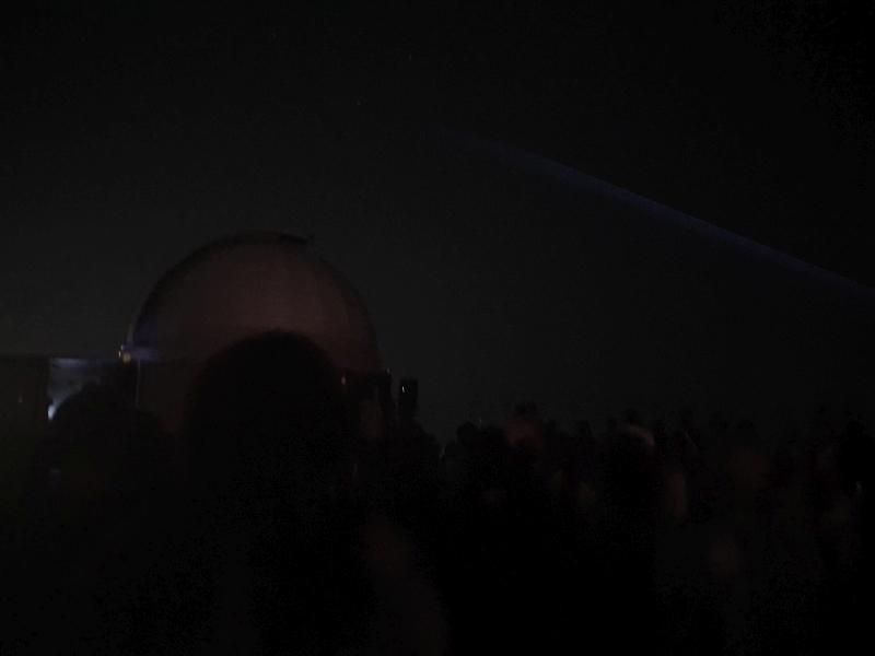 Buiten het gebouw stond een iets kleinere telescoop opgesteld, waar we ook doorheen konden kijken. We hadden geluk, dat we er vroeg waren, want we konden vrij snel naar binnen. Een half uur later stond er al een lange rij voor beide telescopen.
