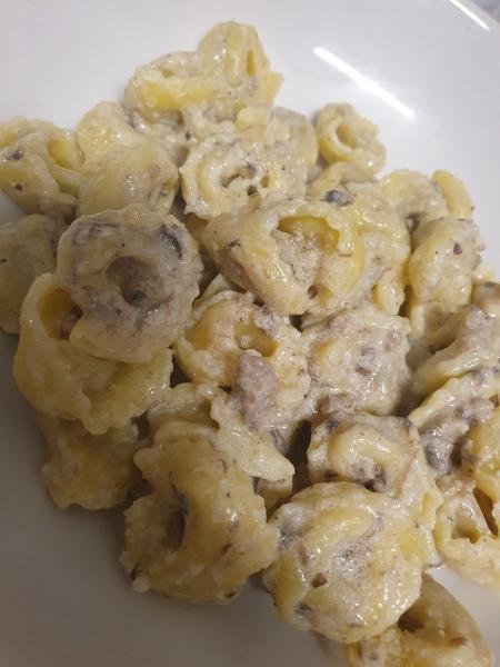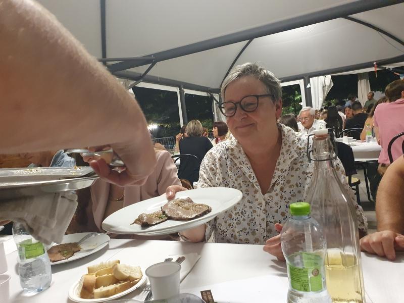Het eten bleek typisch marchigiaans; heerlijk, maar ook heel eenvoudig: gouden borden en kaviaar zouden niet gepast zijn geweest voor de nederige kapucijner monniken. De volledige maaltijd kostte € 25 per persoon, inclusief water. Andere drankjes werden apart aangerekend, maar waren ook zeer betaalbaar. We aten tortellini alla norcina (met worst en truffelcrème) en mals gebraden kalfsvlees met gekookte groenten. Alles werd met zorg geserveerd door de vrijwilligers, men kon ook bijvragen..