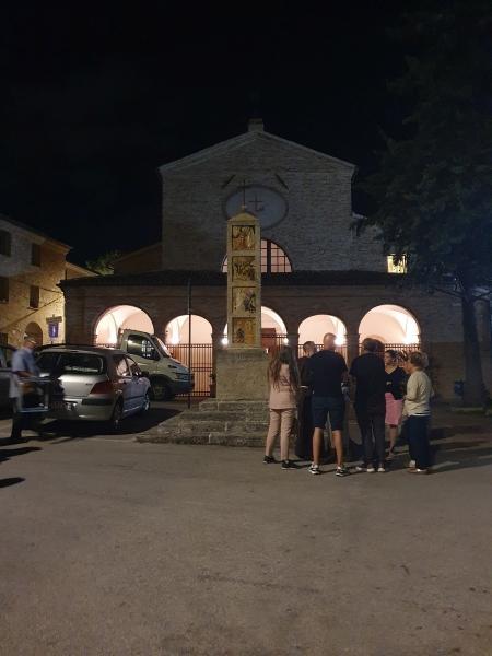 Bij het vertrek zien we de keramische zuil van de in Recanati geboren kunstenaar Rodolfo Ceccaroni, waarop een van de priesters afscheid neemt van enkele gasten. Tevreden keerden we huiswaarts.