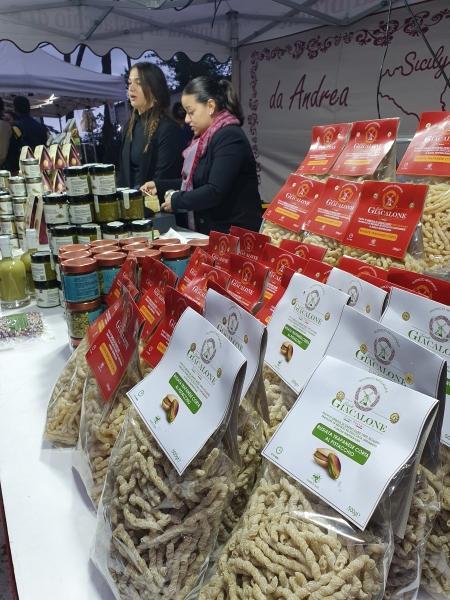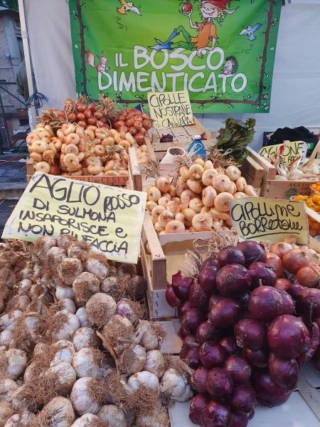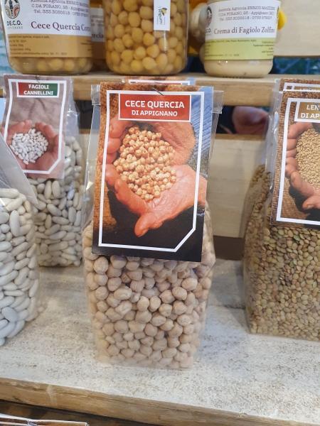 We parkeren op een grote parkeerplaats aan de rand van Appignano en zien een rij kraampjes langs de prachtige stadsmuren. Ze bieden specialiteiten uit Midden-Italië aan, zoals porchetta (gebraden speenvarken), knoflook, uien, noten, gezouten kabeljauw en bacala, wilde kersenwijn, kastanjes en natuurlijk allerlei peulvruchten uit Appignano: kleine, malse linzen (lenticchie), kikkererwten (ceci), witte bonen (fagioli) en borlottibonen (borlotti).