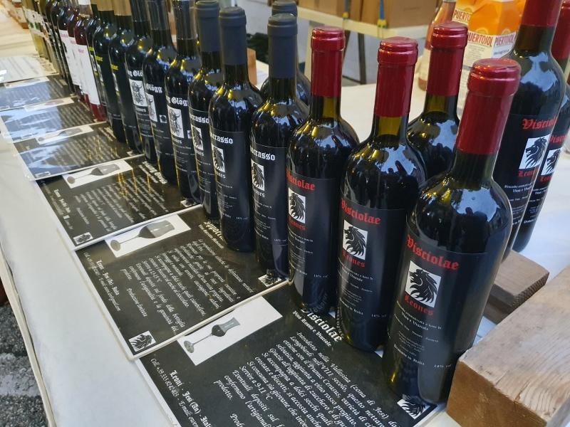 Het derde gerecht bestaat uit witte bonen met zachtgekookt varkenszwoerd, een lokaal gerecht uit de boerentraditie. Ook erg lekker, maar we zitten ook vol. Gelukkig bestaat het dessert slechts uit een klein glas typische wilde kersenwijn (Visciola) met koekjes, die we met een voucher bij de kraam buiten kunnen halen. De frisse lucht doet goed!