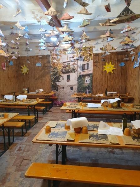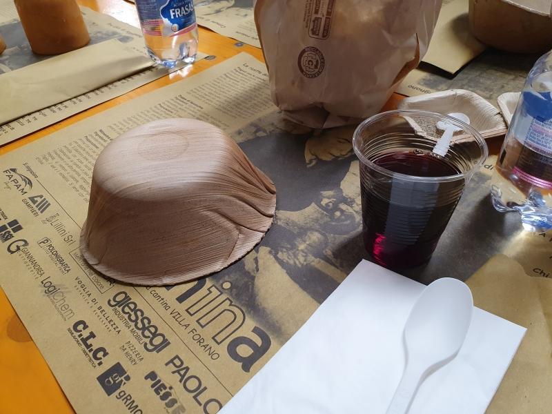 We beginnen honger te krijgen. In het stadhuis kunnen we kaartjes kopen voor de maaltijd: er is maar één menu, bestaande uit drie gangen, plus dessert, koffie, wijn en water. De goedkoopste optie kost € 15; voor € 20 kun je de maaltijd zelfs in keramische kommen krijgen, die je daarna mee naar huis kunt nemen. Wij kiezen voor één met en één zonder keramiek.