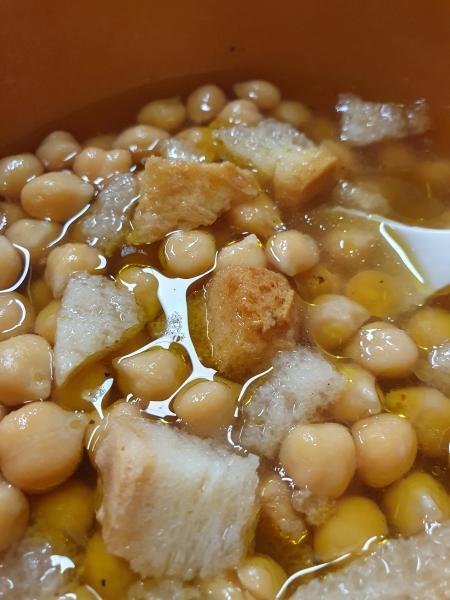 Er is genoeg wijn en al snel beginnen ze met het serveren van het eerste gerecht: een heldere bouillon met kikkererwten en rozemarijn. Er worden droge stukjes brood bij geserveerd, die je in de soep hoort te weken. Erg lekker, maar de ober was te gul en gaf ons een royale portie. En er komen nog twee gangen, plus een dessert! Het probleem: ik kan het niet zomaar laten staan. Ten eerste is het heel zeldzaam dat mensen eten laten staan, en ten tweede heb ik mijn kommetje nog nodig voor de tweede en derde gang.