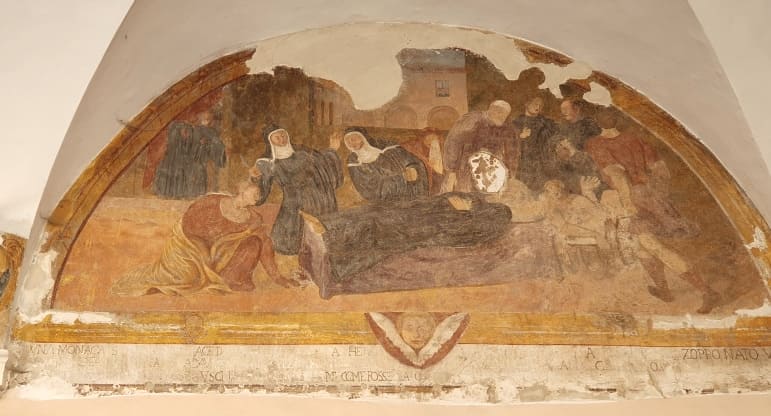 Wel konden we de vroegere kloosterommegang betreden, waarbij nog mooie fresco’s op de wanden prijkten en langs de hele zuilengalerij uitlegpanelen met het verhaal van de geschiedenis van het Schrift. Tevens stonden er enkele drukpersen tentoongesteld.