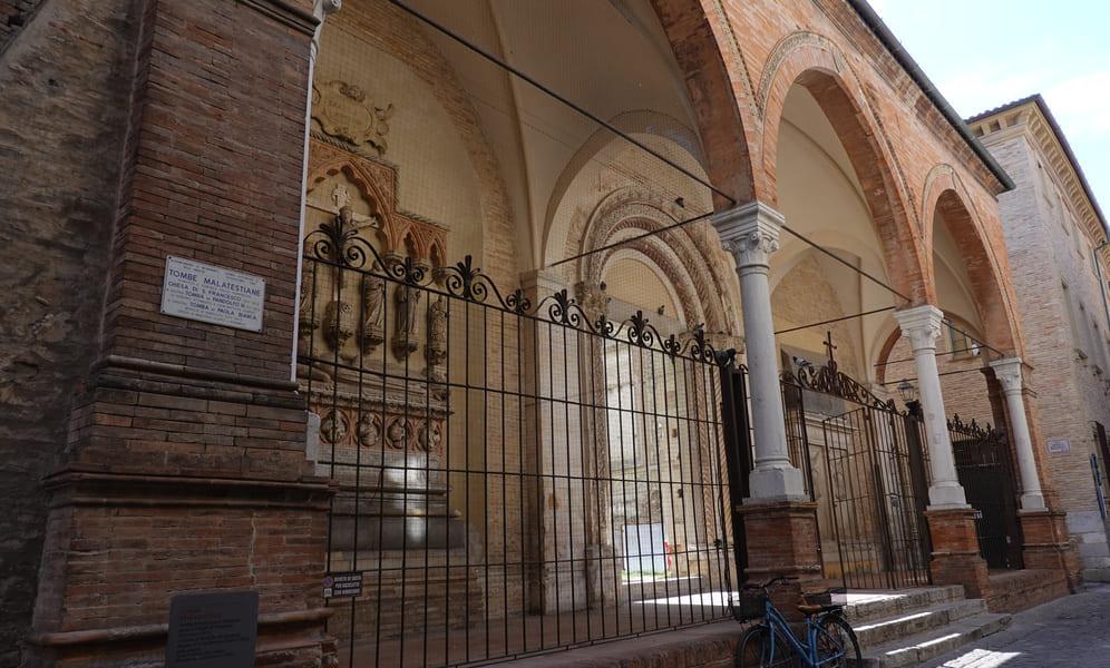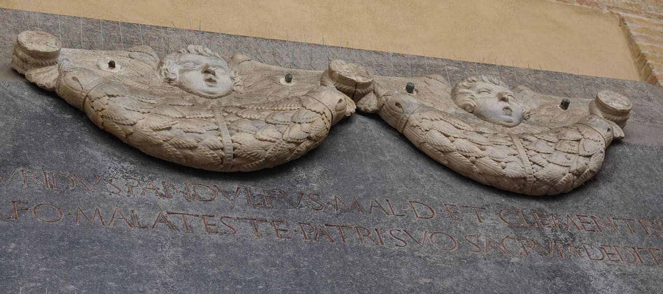 Net voorbij dit gebouw beland je bij een groot voorportaal. Op de muur vermeldt een plakkaat Tombe Malatestiane, de graven van de familie Malatesta, ooit een machtige familie. Links zie je het praalgraf (14de eeuw) van Paola Bianca, de vrouw van de toen heersende PandolfoIII Malatesta. Rechts ervan bevindt zich zijn graf uit de 15de eeuw.