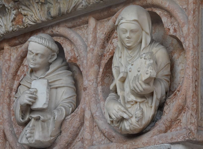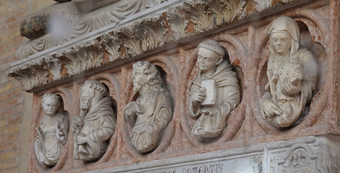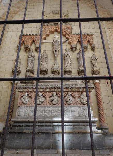 Ook hun arts Bonetto da Castelfranco kreeg er een plaats. Fotograferen blijkt moeilijk, want een ijzeren hek beschermt het voorportaal, enerzijds tegen vandalisme en anderzijds tegen de duiven.