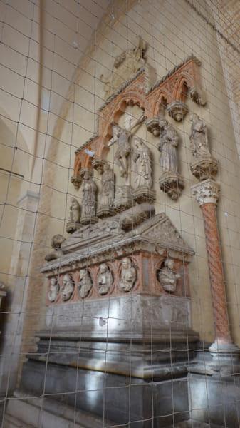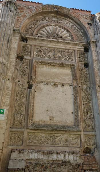 Wat een eigenaardige plaats voor begravingen, denk je op het eerste zicht. Maar dan valt de opening op, de ingang naar een gebouw zonder dak! We betreden dan ook de ingang en zien de resten van een kerk: de Sint-Franciscuskerk. Ooit lagen de Malatesta`s en hun arts in de kerk begraven maar werden in de 17de eeuw verplaatst naar de huidige plek.