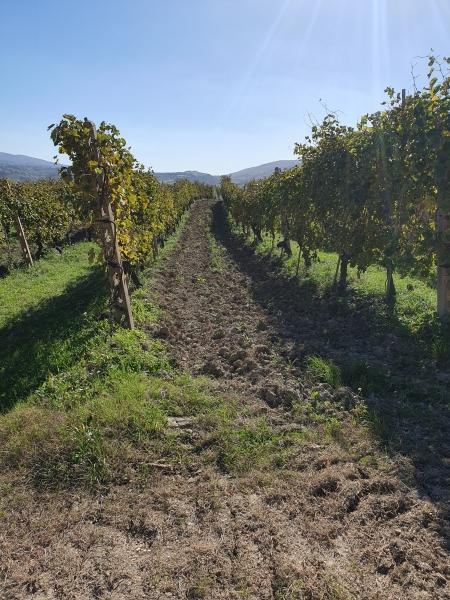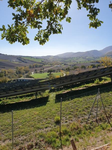Een klein eindje verderop merkten we links twee onverharde wegen van lichtgekleurd, verhard grind . We namen de tweede en startten meteen de klim omhoog richting de karsthelling. Voorbij een zonne-energiepark genoten we van het uitzicht op wijngaarden en heuvels. In de verte zagen we de Monte San Vicino met zijn karakteristieke vorm en de steengroeve aan de rand van het