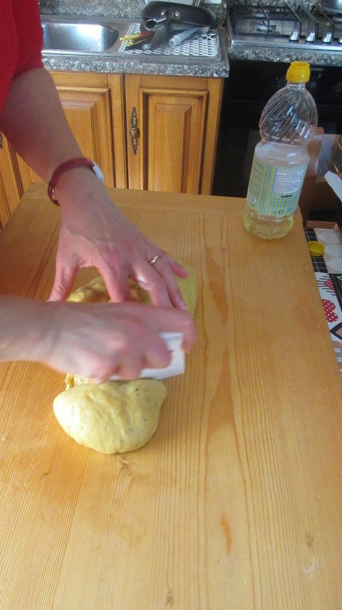 In einer Schüssel 3 Eier mit dem Zucker, dem Pflanzenöl und dem Most mit der Hefe verrühren. Nach und nach das Mehl hinzufügen. Wenn der Teig fester wird, kneten, bis er weich und elastisch ist, dabei die Anissamen dazugeben.