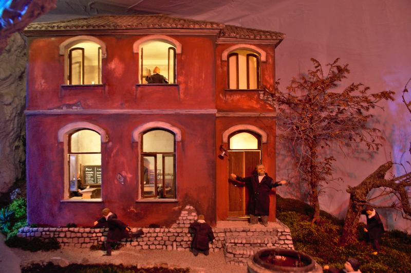 Die Figuren sind mechanisch animiert – der Schmied schlägt auf seinen Amboß ein, die Mama rollt den Teig aus und der Pedell im Schulgebäude läutet die Schulglocke. Sobald die Sonne untergeht und die Landschaft sich verdunkelt, stellen auch die Figuren ihre Bewegungen ein.
