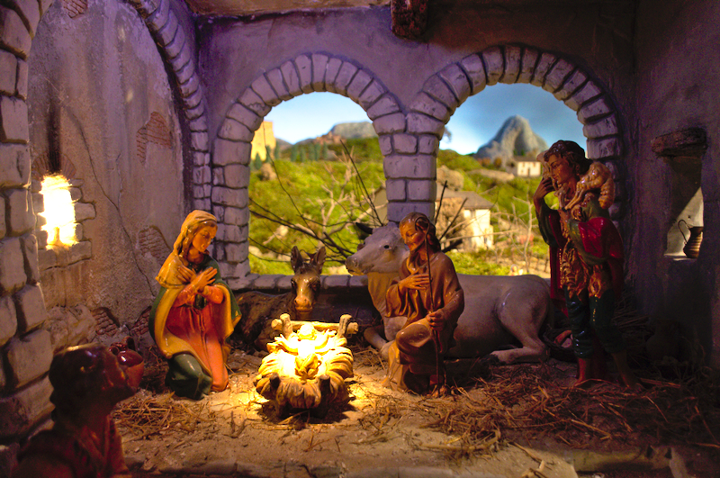 So fand ich es sehr aufregend, daß in Italien immer noch eine sehr lebhafte Krippentradition existiert. Das mag damit zusammenhängen, daß die erste Weihnachtskrippe 1223 vom hl. Franz von Assisi in Greccio in der Nähe von Rom erfunden wurde. Franziskus war aus Palästina zurückgekehrt und anstatt eine Predigt über die Geburt Christi zu halten, stellte er – mit Erlaubnis des Papstes Honorius III – die Geburtsgeschichte mit lebenden Darstellern nach. Dabei hatte er vermutlich nicht geahnt, daß in den folgenden Jahrhunderten Krippen in aller Welt Einzug in die Kirchen und sogar Wohnzimmer hielten.