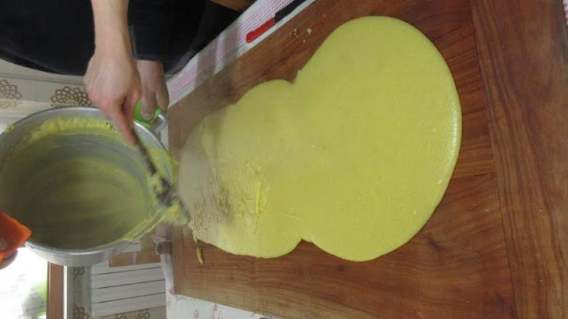 Nach circa 35 Minuten, wenn die Masse dicker geworden ist, kann man die Polenta auf ein Brett oder einen großen Teller ausstreichen.