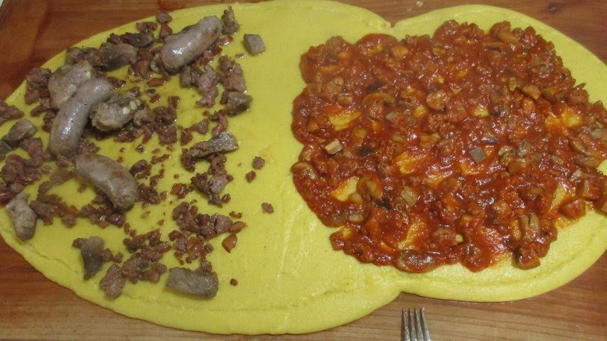 Polenta gibt es hauptsächlich in Nord- und Mittelitalien und die Zubereitungsweisen variieren von Region zu Region. Während die Polenta im Norden eher fest gebacken und in Scheiben aufgeschnitten wird, hat sie in den Marken eher die Konsistenz von Kartoffelpüree und wird auf Teller oder Bretter ausgestrichen. Im Video weiter unten sieht man sehr gut, wie Mamma Graziella das macht.