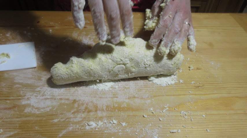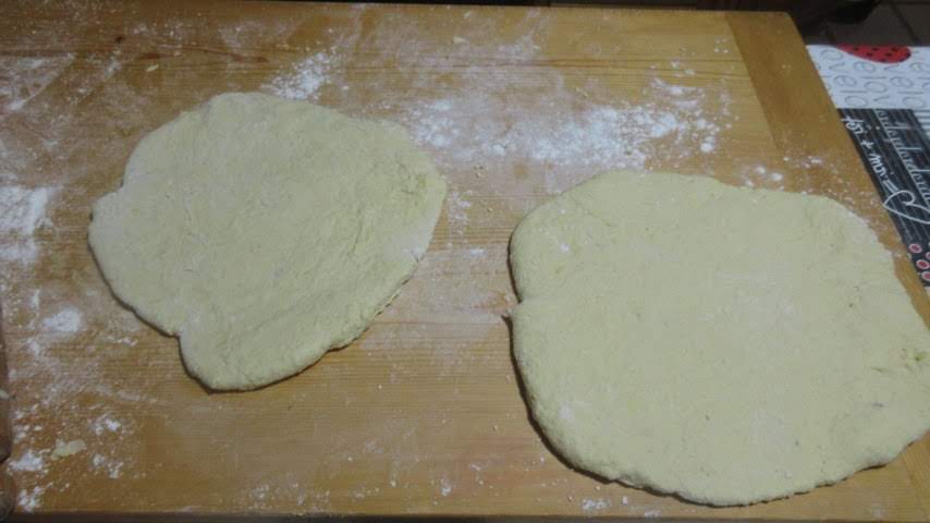 Man zerdrücke die Polenta-Reste und vermische sie mit Mehl bis ein Teig entsteht, den man ausrollen kann. Nun mit der Backrolle zu Fläden ausrollen.