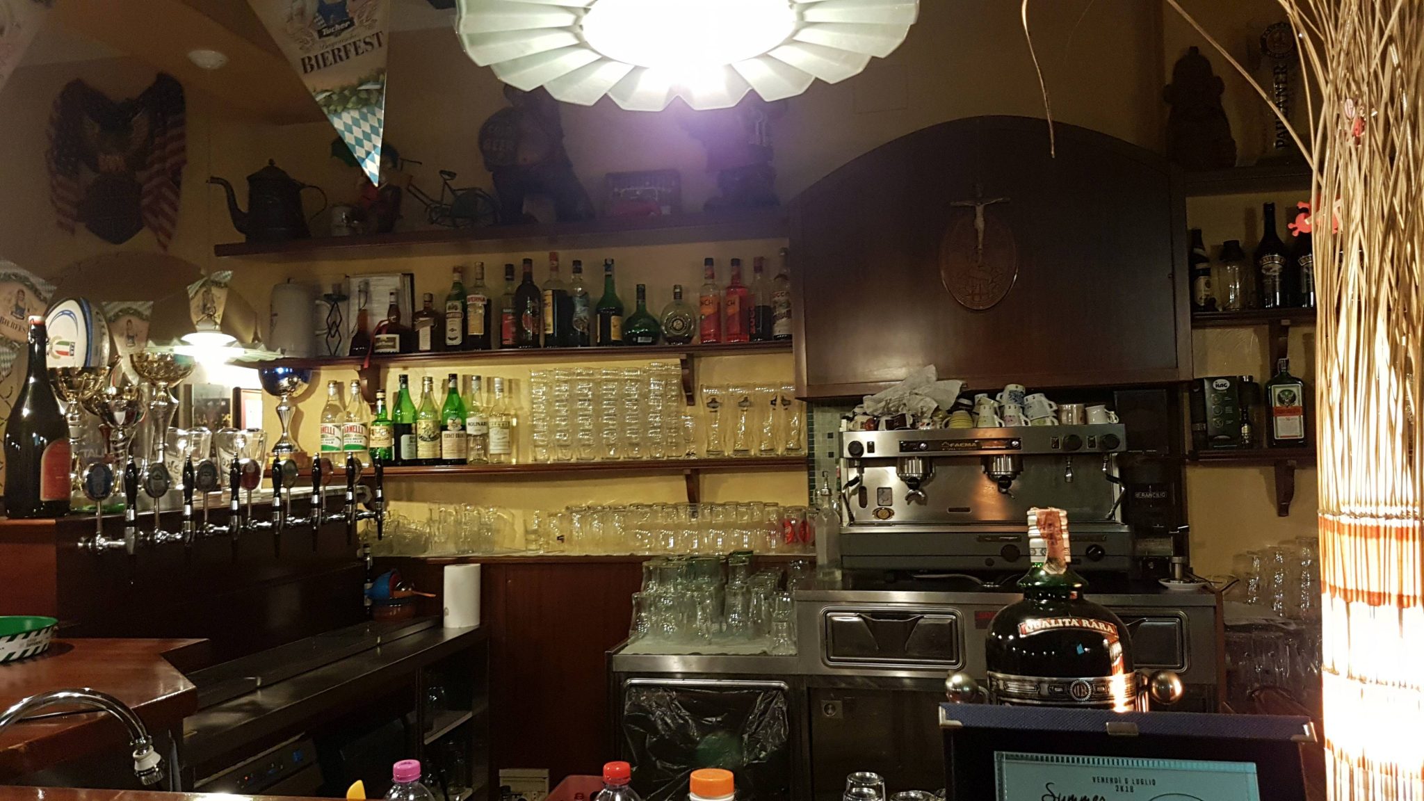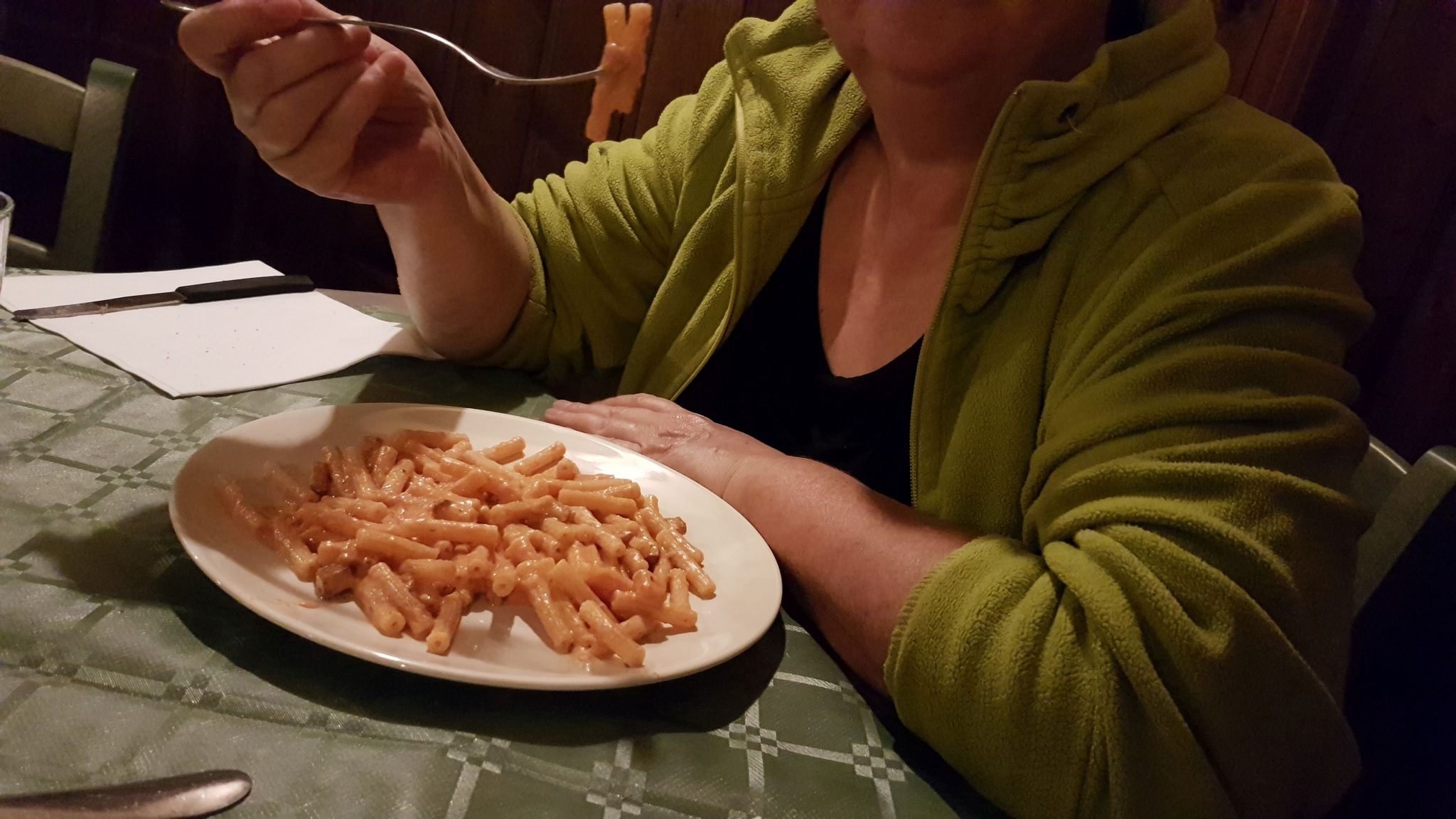Mit meinem Faible für interessante Biografien und meiner Liebe zu gutem Essen, mußte ich das „Mac’Iste“ natürlich besuchen. Der erste Versuch scheiterte schon daran, daß wir nicht reserviert hatten und der Laden rappelvoll war. Aber dann klappte es: Das Restaurant erinnert eher an einen englischen Pub und ist wohl auch bis spät nachts geöffnet – eine Seltenheit in Italien, wo man normalerweise nicht den ganzen Abend in einer Kneipe verbringt. Wir geben unsere Bestellung ab – natürlich wählen wir die „Macheroncini al Fumé“, sowie eine Pizza. Während wir warten können wir die Dekoration betrachten – überall stehen Pokale und hängen Urkunden von Macistes Siegen bei Bodybuilding Wettbewerben. Und dann kommt er auch kurz aus der Küche, mit Kochschürze und Muskeln, die prall das T-Shirt füllen, und sagt uns freundlich und eher bescheiden im Auftreten, daß unser Essen gleich kommt.