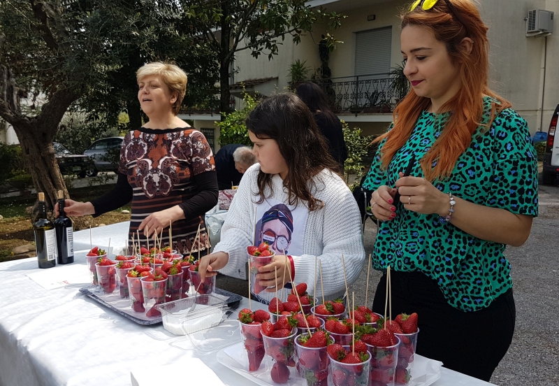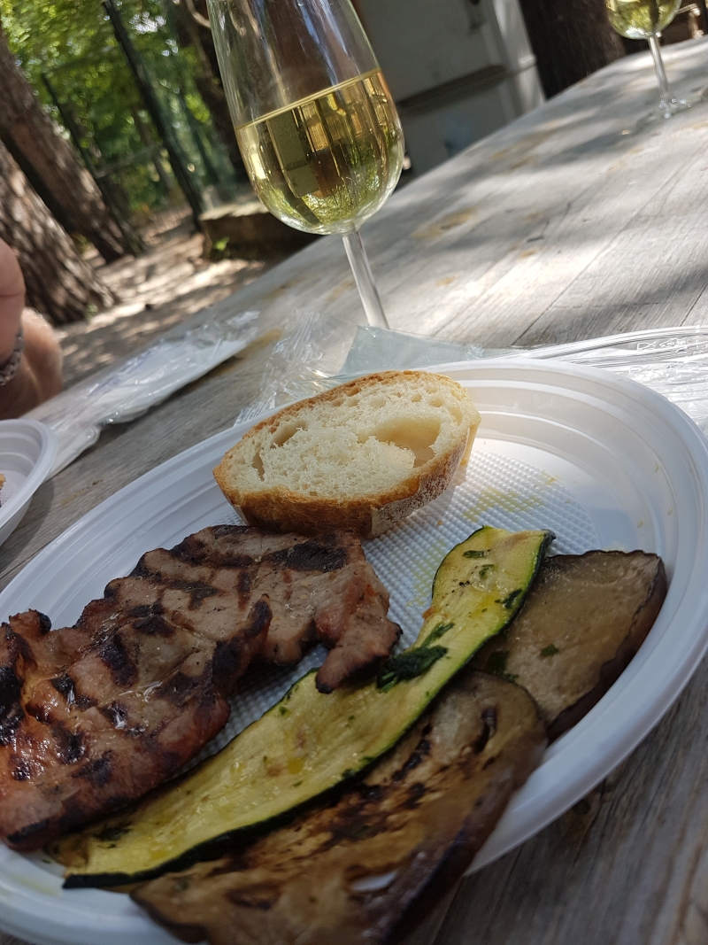 Zur nächsten Station mussten wir wiederum einen kleinen Anstieg bewältigen und fanden uns dann im Park „Colle Elisa“ ein, wo es auch wieder schattige Sitzgelegenheiten gab. Zum Essen bekamen wir gegrilltes Fleisch und Gemüse und Wassermelone danach. Und Wein. Und Musik. Inzwischen waren alle schon sehr fröhlich und es wurde getanzt und mitgesungen. Die Aufenthalte an den Stationen wurden immer länger, zumal zum Zeitvertreib die Mannschaftsspiele stattfanden: Fazoletto, wo zwei Mannschaften darum wetteiferten, ein Stofftuch zu ergreifen. Oder auch Sackhüpfen.