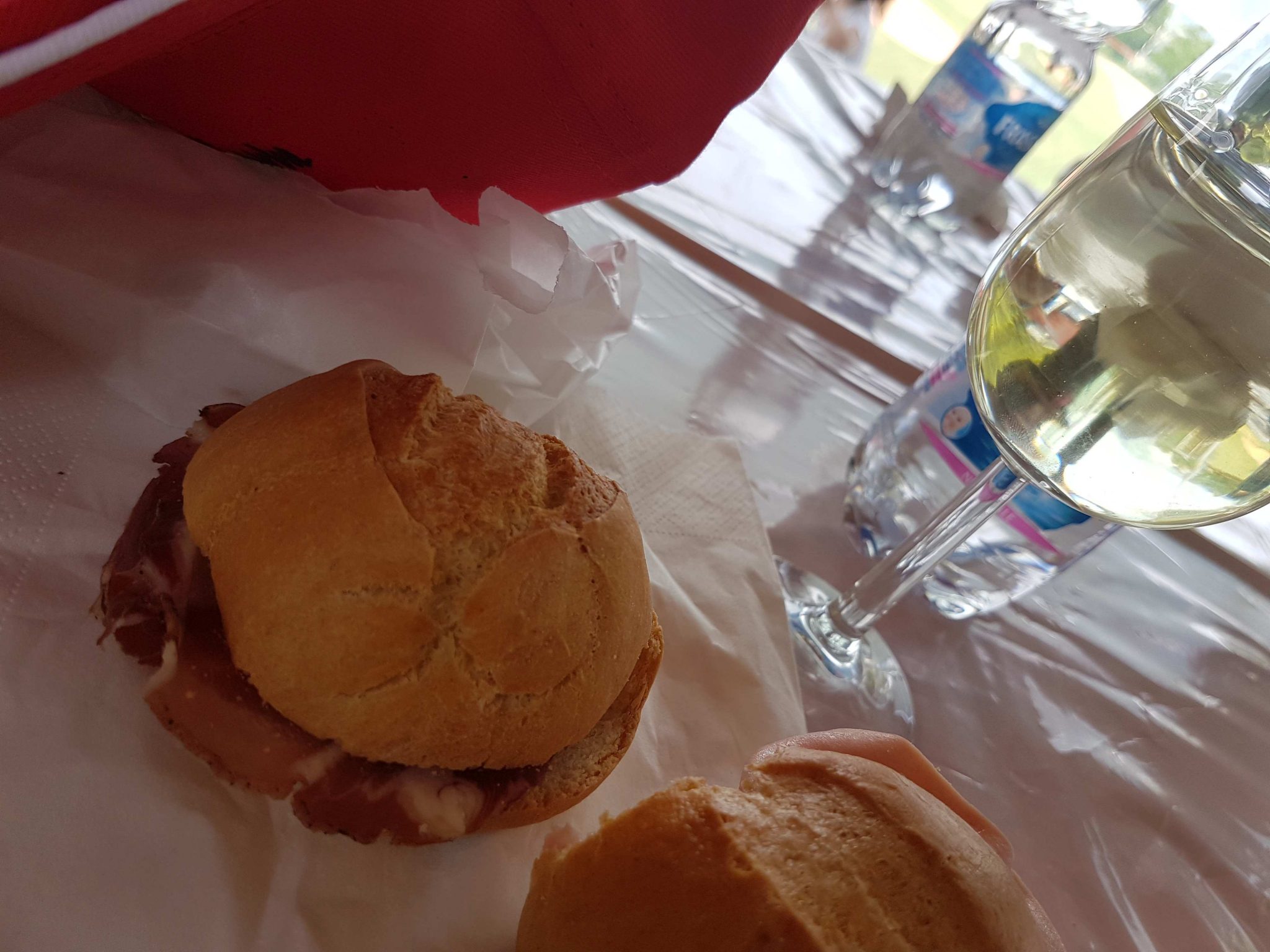 In Cupramontana trafen wir uns bei der Anmeldung im Ort. Das Ausrüstungspaket gab es ab 10:00 Uhr morgens. Gut 300 Personen machten mit, in Treia waren es sogar 900. Die erste Station war das Baseball-Stadion am Ort. Hier gab es Frühstück: 2 kleine Brötchen mit Schinken. Dazu schon das erste Glas Verdicchio-Weines für den, der möchte. Eine Gruppe Musiker spielte schon lokale Lieder, darunter den in der Gegend typischen „Saltarello“.