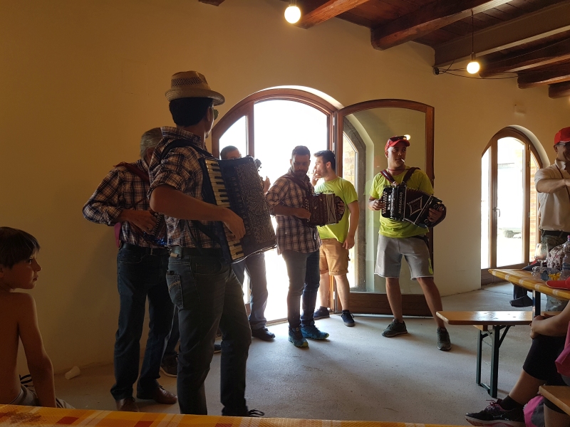 Es folgte der erste Anstieg zur nächsten Versorgungsstation, die sich in einer restaurierten, alten Ziegelei befand. Hier gab es Pasta mit Fleischsauce und natürlich wieder Wein. Die Musiker spielten auf und sangen dazu im Dialekt. Es gab bequeme Tische und Stühle im schattigen Inneren der Ziegelei. Und man konnte sich für Mannschaftsspiele registrieren, die am nächsten Halt stattfinden sollten.
