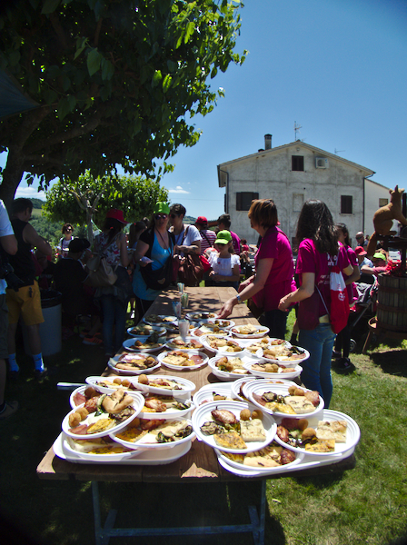 Die Magnalongas werden in einigen Orten der Marken (und ganz Italiens) organisiert, es lohnt sich, nach den jeweiligen Terminen Ausschau zu halten. Wir haben dieses Jahr 25 EUR pro Person gezahlt, aber es gibt Kinderermässigungen. Dieses Jahr fanden mindestens zwei schon am 1.Mai statt (Mogliano und Treia). Am 2. Juni gibt es wieder den tollen Magnalonga hier in Cupramontana und später vielleicht noch einen in der Provinz Macerata. Und am 25. Mai gibt es den „Mangialonga Picena“ in Offida.