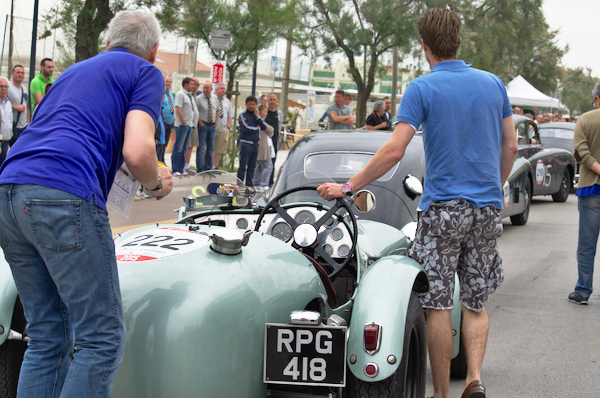 Jedes Jahr fahren immer auch Prominente mit, darunter waren in den letzten 5 Jahren Rennfahrer-Legenden wie Joachim Stuck, der Belgier Jacky Ickx, Jochen Mass und Walter Röhrl, aber auch andere Promis wie Ferdinand Porsche (natürlich auf Porsche), Philip Rösler (wer war das nochmal?), Brian Johnson von AC/DC oder Herbert Grönemeyer (mit einem Bentley). Dieses Jahr habe ich auf der vorläufigen Teilnehmerliste Claudia Kunkel/Christian Geistdoerfer (ehemaliger Co-Pilot von Walter Roehrl) mit einem Porsche Carrera, Jochen Mass mit einem Mercedes 190 SL und Claudia Hürtgen mit einem Jaguar XK 140 OTS Roadster gesehen. Es lohnt sich also, mal in die oft offenen Rennwagen zu schauen! Das ganze Programm, Teilnehmerliste, Fotos der letzten Jahre etc findet man auf der Mille Miglia homepage.