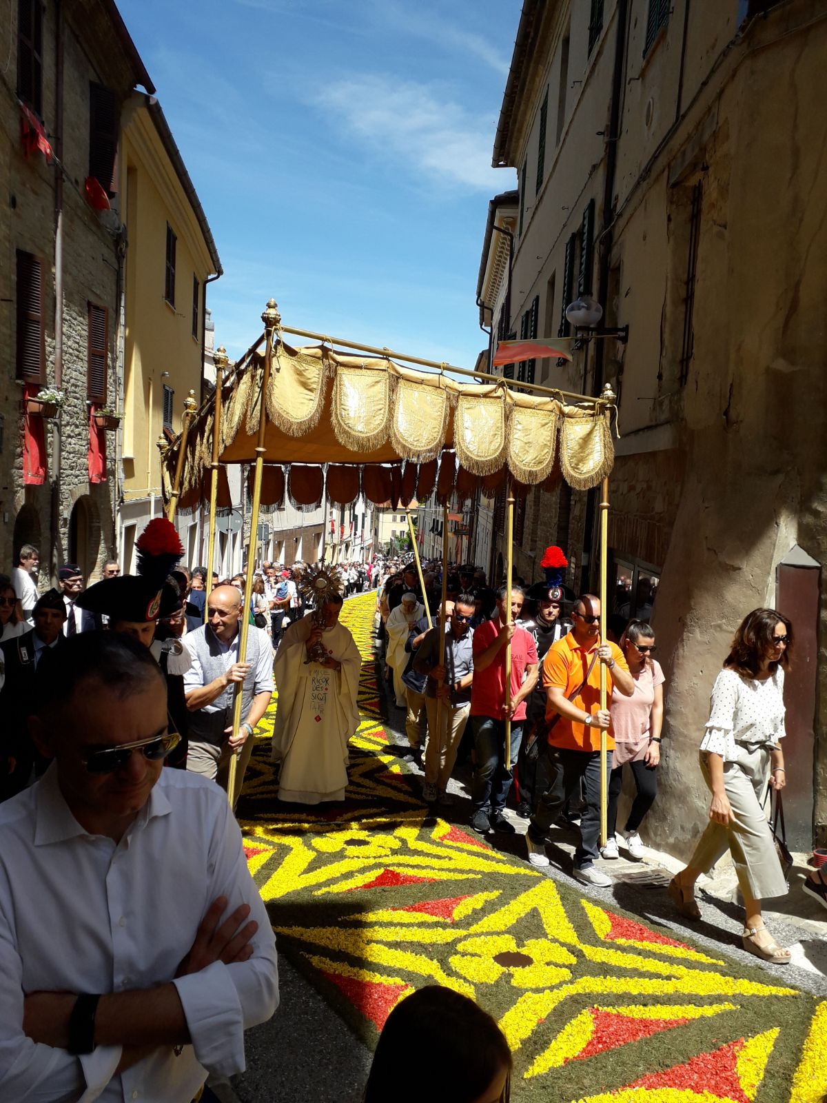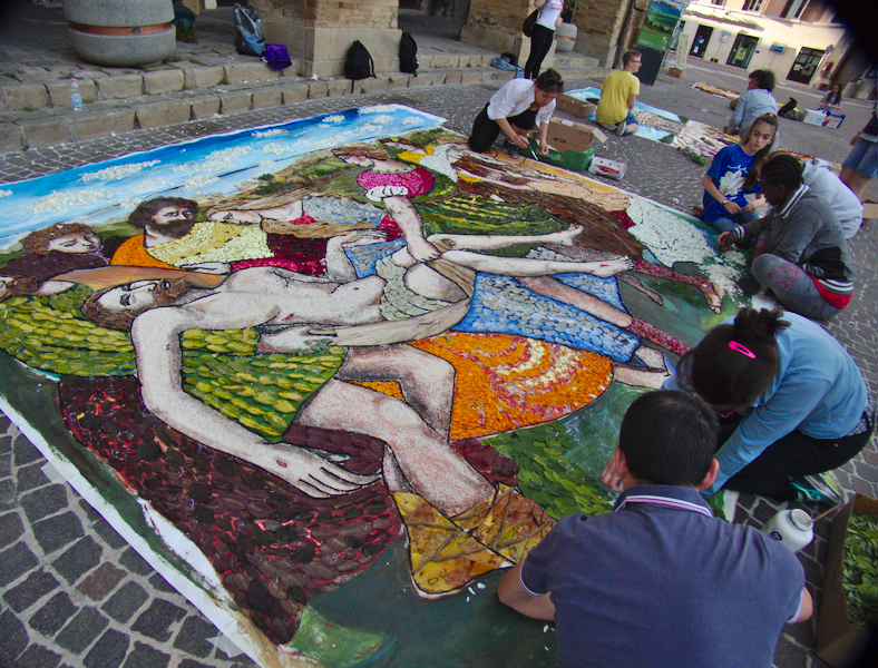 Wie ich anfangs schon sagte, ist der Brauch, zu Fronleichnam Blumenumzüge zu Ehren des Herrn zu machen, sehr verbreitet. Die Laien-Helfer in Cupramontana haben es aber zu einiger Berühmtheit gebracht: vor wenigen Wochen waren sie in Ligurien eingeladen, um dort bei der Blumendekoration des Ortes zu helfen!