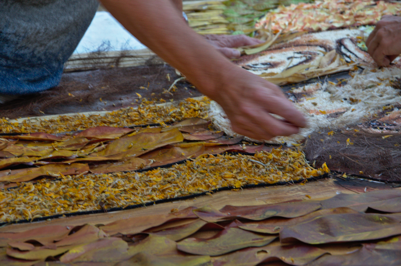 Am Sonntag nach Fronleichnam versammeln sich in den allerfrühesten Morgenstunden zahlreiche Erwachsene und Kinder, um die Straßen mit den Blumenteppichen zu dekorieren. Hier kommen jetzt auch die Holzschablonen zum Einsatz. Wenn man früh kommt, kann man die letzten Freiwilligen noch beim eifrigen Dekorieren beobachten. Da der größte Feind der Blumenkunstwerke Hitze und Sonne sind, werden sie von Freiwilligen den ganzen Tag lang mit Wasser besprüht.