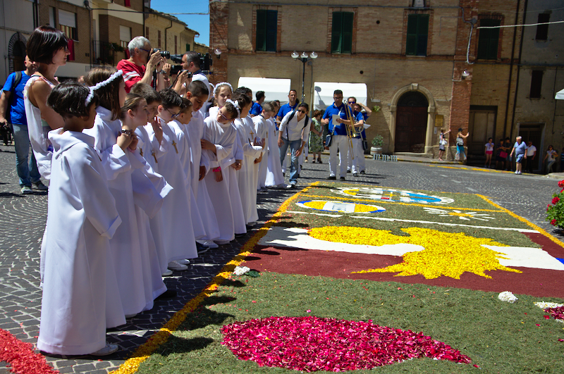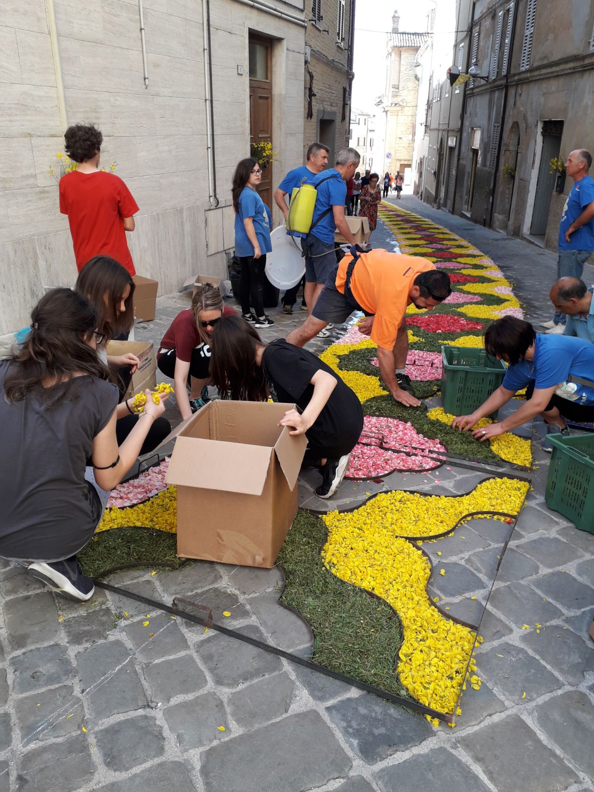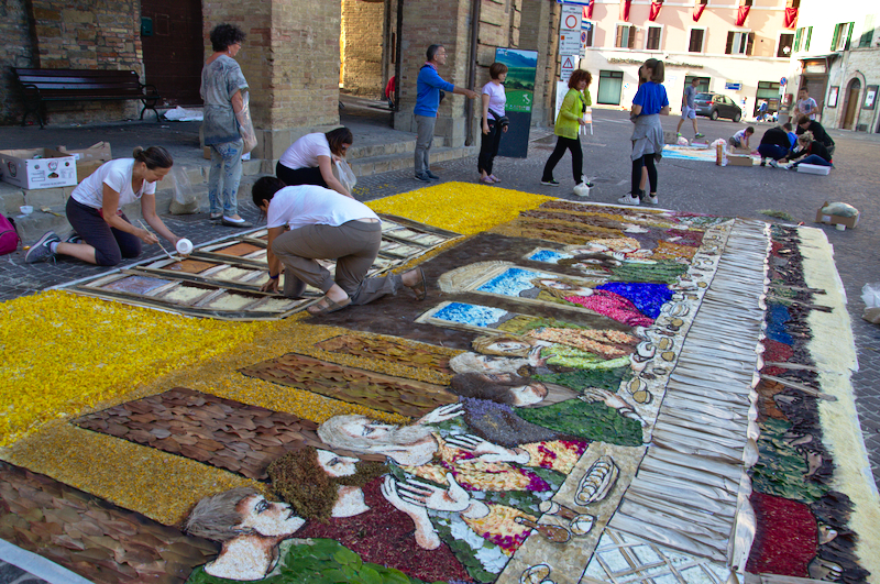 In der Zwischenzeit versammeln sich Freiwillige um Cupramontana und beginnen nach schönen Blüten mit geeigneten Farben zu suchen: Ginster nehmen sie meist für das Gelb, Rosen für das Rot und frisch geschnittenes Gras für das Grün. Danach sammeln ganze „Pflück“-Trupps die Blütenblätter in Tüten, Taschen, Kisten und Kartons. Da Corpus Domini nicht immer am selben Datum ist, kann es sein, daß manche Blütenfarben in manchen Jahren selten sind. Dann wird mit eingefärbten Holzspänen ausgeholfen.