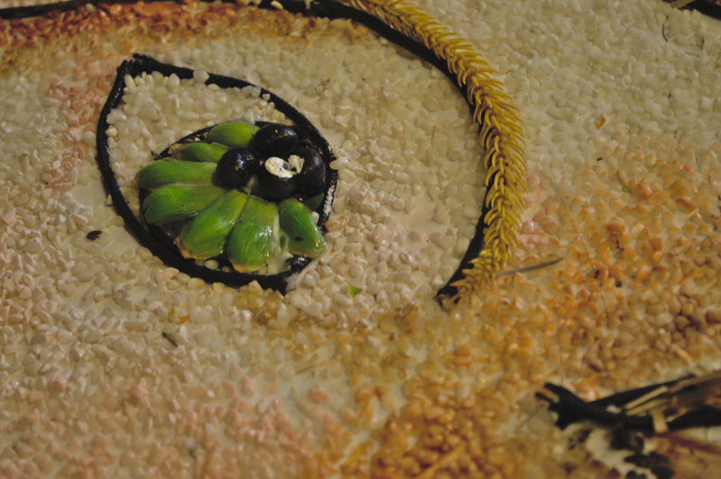 Neben den geometrischen Mustern kümmert sich die Kunstlehrerin auch um Reproduktionen berühmter Kunstwerke, die bereits 1 bis 2 Wochen im voraus mit Blumen, Gräsern und Körnern erstellt und in stundenlanger Arbeit aufgeklebt werden.