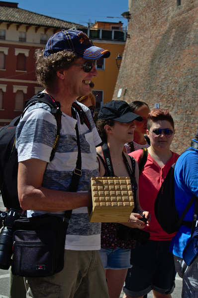 Danach wanderte die Gruppe zum Rathaus mit seinem großen, beeindruckenden Glockenturm, und dann zu einem Aussichtsturm mit Meerblick und einer Waffenkammer inklusive gut erhaltener Ritterrüstung. Mondolfo entpuppte sich als Ort der schönen Uhrentürme (Campane): die Leute hörten regelmäßig Glockenspiele, so wie das der Post, die früher damit signalisierte, dass im Ort Post angekommen war.