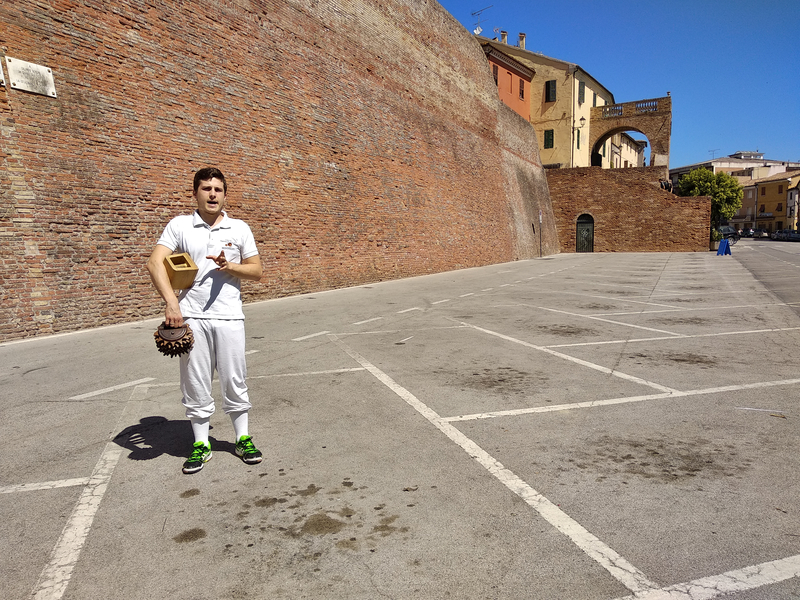 Und danach zum „Sferisterium“, einem großen Platz ausserhalb der Stadtmauern, wo das „Pallone al Bracciale“ genannte Ballspiel gespielt wird. Den Schläger bildet dabei ein großes Holzarmband, welches die Spieler tragen und mit dem sie sich den Ball über eine Wand zuspielen. Tennis ist eigentlich eine moderne Version dieses Spieles, und die zählweise der Punkte ist immer noch dieselbe wie beim Pallone.