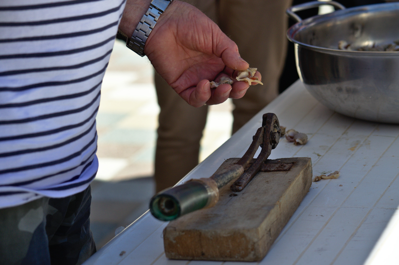 Gastronomisch wurde einiges geboten: Am Strand kredenzten 3 alte Meerjungfrauen Garagojs. Garagojs sind Meeresschnecken, die erst geknackt werden müssen, bevor sie in einer schmackhaften Sauce landen. Das Rezept blieb natürlich geheim. An langen Tischen wurden die Garagojs schließlich gegessen: man mußte sie schlürfen und aussaugen, was nicht einfach war und zu großer Heiterkeit in der Gruppe führte.