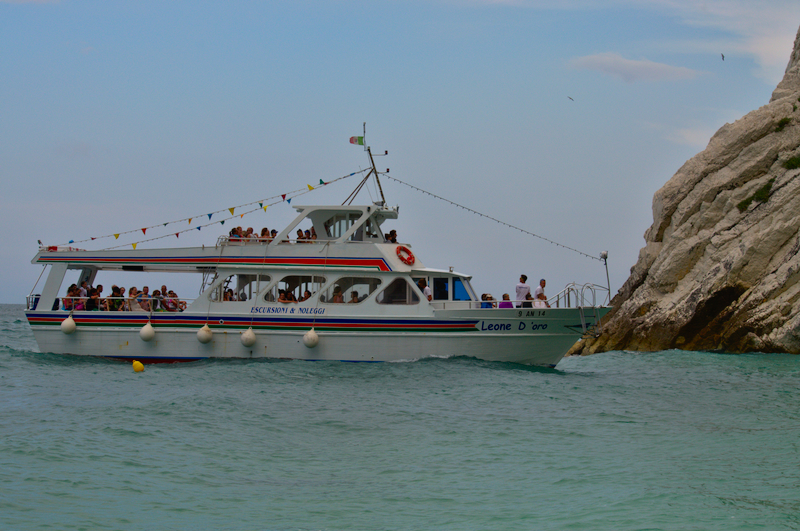 Dann fuhren wir entlang der wunderschönen Monte Conero Steilküste, wobei die Schildkröte mit ihren Begleitern auf einem der Boote mitfuhr. Während der Fahrt erzählten die Tierschützer etwas über ihre Arbeit und über das Leben der Meeresschildkröten in der Adria. Am pittoresken 2 Sorelle Strand machten die Boote fest und wir gingen an Land. Da dieser Strand im Naturschutzgebiet liegt und nur schwer zugänglich ist, ist er ideal, um eine Schildkröte wieder ungestört in die Freiheit zu entlassen.