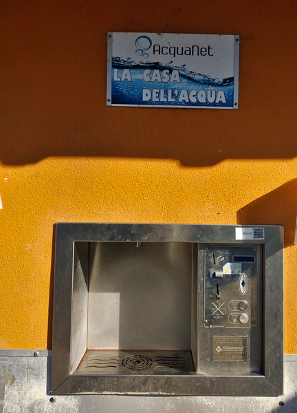 Lange Zeit schienen mir die Supermärkte in Italien übervoll mit Plastikwasserflaschen, die die Leute in großen Mengen aus den Läden abschleppten, einen Berg von Plastik-Müll verursachend. Aber seit es vielerorts die Wasserhäuser, die „Casa dell‚Acqua„ gibt, sieht man weniger Plastikwasserflaschen und der Müllberg schrumpft.
