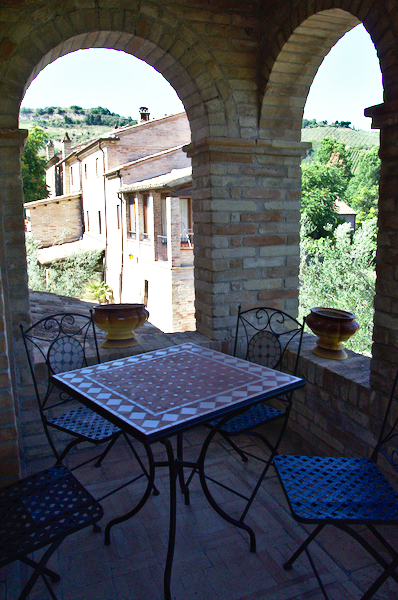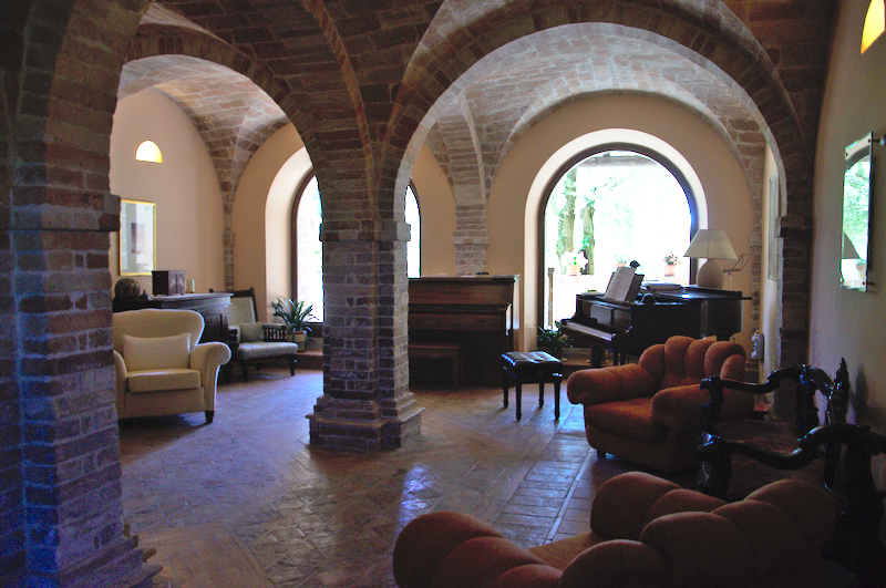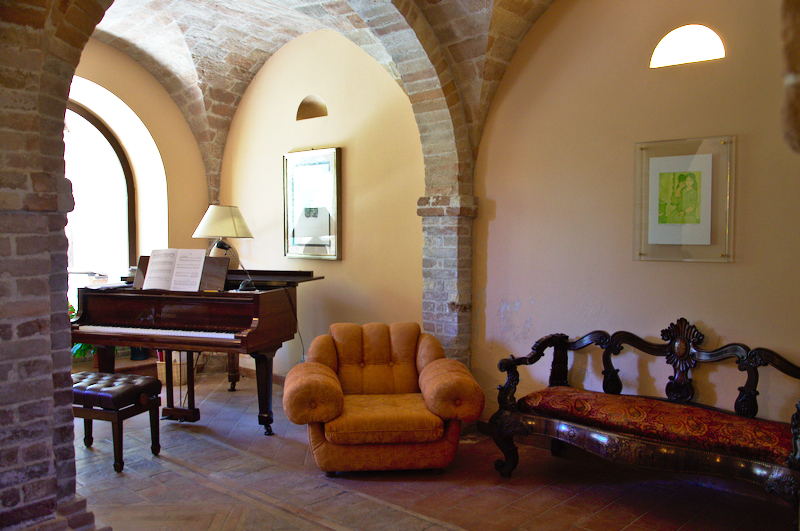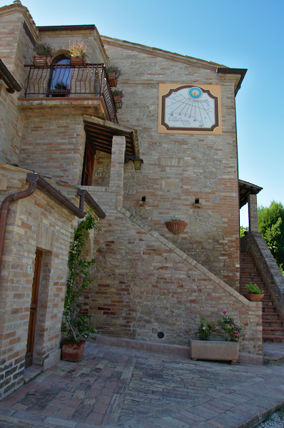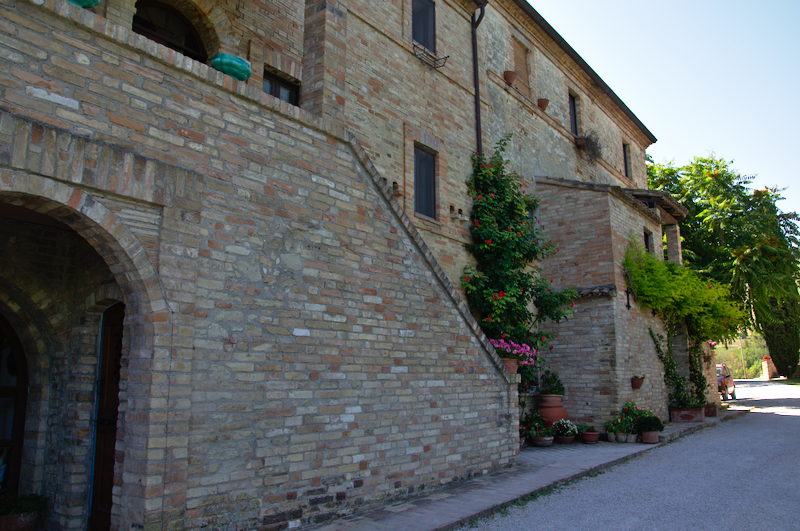 Elisa, die Schwiegertochter des Professors, begrüßte sie herzlich und erzählte die besondere Geschichte dieses Agriturismo: 1980 beschlossen 20 Freunden aus Mailand, ihr Leben radikal zu ändern, um irgendwo in Italien neu zu beginnen. Sie landeten in den Marken an genau diesem magischen Ort, der damals allerdings noch aus vielen Ruinen, einem Haus und viel Land bestand. Langsam und mit viel Respekt vor den alten Gemäuern, restaurierten sie die Gebäude, deren Schönheit auch von den Unregelmäßigkeiten herrührt, die alte Gebäude so an sich haben, und die sie liebevoll erhalten haben.