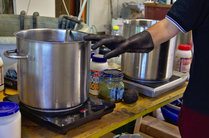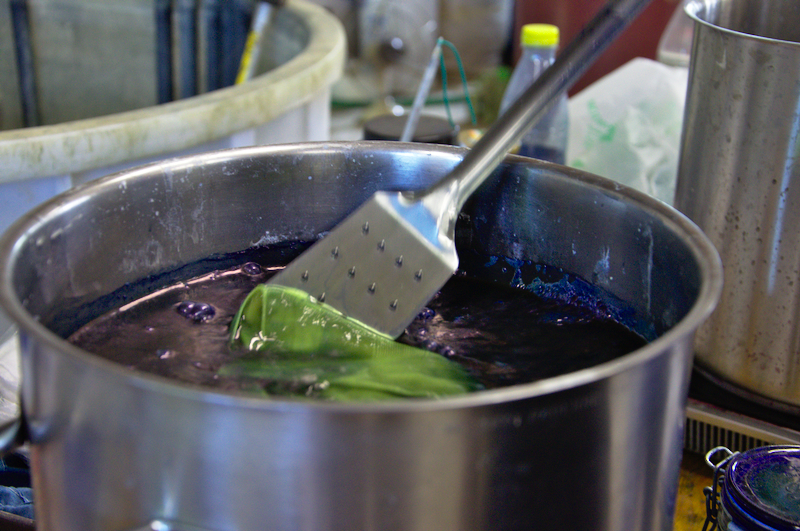 In einer Pfanne mit grüner Flüssigkeit waren die Pflanzen gekocht und bereits entfernt worden. Jetzt wurde Ammoniak zugegeben – früher verwendete man dafür Urin. Dann nahm der Professor eine handvoll weißen Staubs und streute ihn in die Flüssigkeit. Und der magische Prozess begann: Aus der Pfanne zog er ein grünes Tuch. Sollte das nicht blau werden?