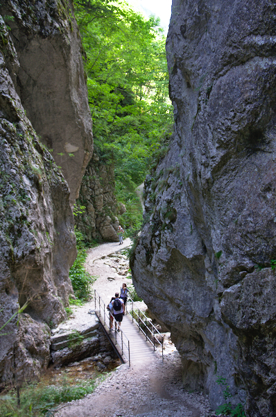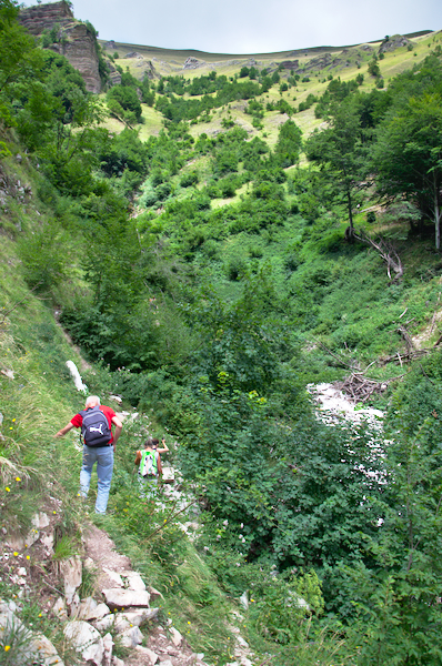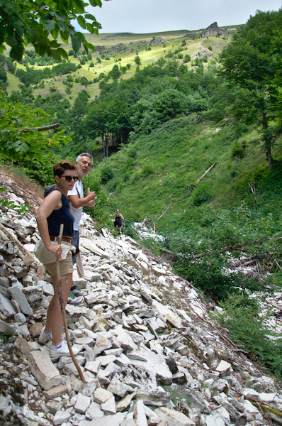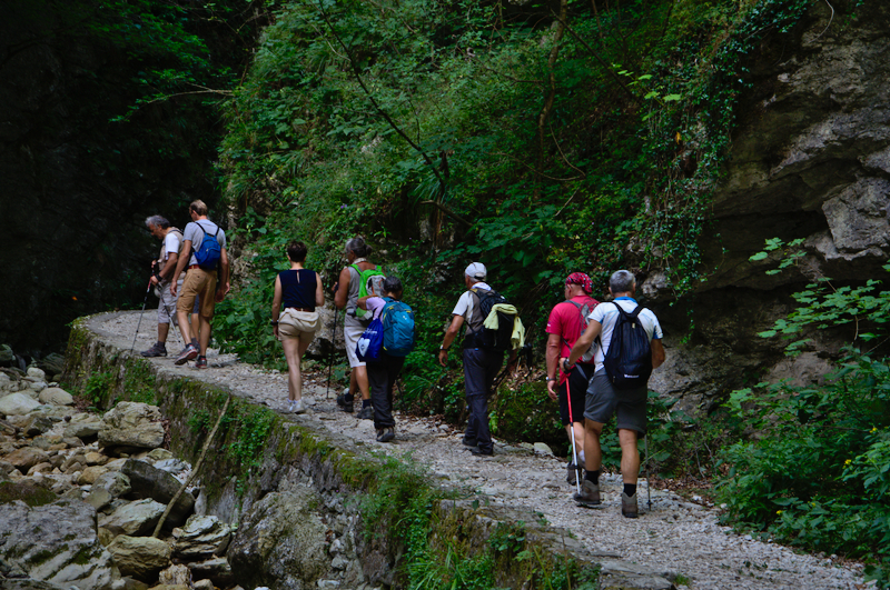 Der Wanderweg ist auch für nicht so erfahrene Wanderer geeignet und schlängelt sich entlang der Schlucht, vorbei an verschiedenen kleineren Wasserfällen und Wasserkaskaden (Pisciarelle genannt). Und obwohl Hochsommer war, war jetzt immer noch Wasser in den Kaskaden. An einem Punkt mußte die Gruppe sogar kleinere Wasserfälle durchqueren – bei diesem Wetter war das eine willkommene Abkühlung.