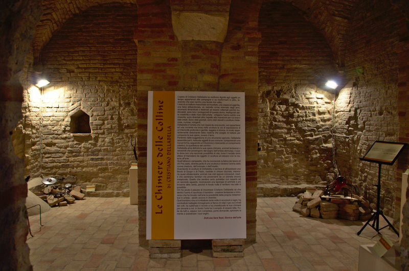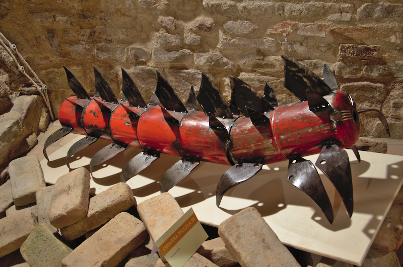 Es wurde Zeit für eine ernsthafte Ausstellung: Die Kunsthistorikerin Sara Tassi baute eine wunderschöne Ausstellung im Kapitelsaal der ebenfalls sehenswerten romanischen Abtei Santa Maria in Moie auf: „die Chimären der Hügellandschaft“ (Le chimere delle colline). Das Wort Chimäre entstammt der griechischen Mythologie und bezeichnet eine Art Mischwesen, das aus verschiedenen Tierteilen besteht: bei Homer zum Beispiel ein Tier mit Löwenkopf, Ziegenkörper und Drachenschwanz. So enthalten auch Cristianos Objekte Aspekte verschiedener Tiergestalten und der Besucher kann beim Betrachten seiner eigenen Phantasie freien Lauf lassen und seine eigenen Ideen einbringen.