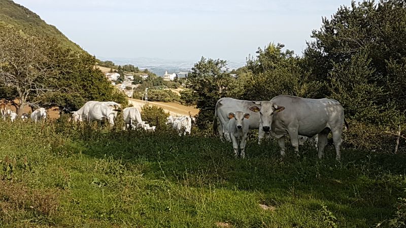 Wenn man in den marchigianischen Bergen wandern geht, sieht man nicht selten freilaufende Rinder der Sorte „Razza Marchigiana„ – in den Bergen ist es im Sommer nicht so warm wie an der Küste und die Rinder sind recht robust.