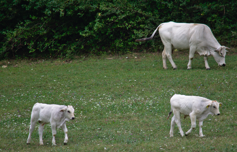 Was Rindfleisch angeht, gibt es da in den Marken eine gute Alternative: die „Razza Marchigiana„, die marchigianische Rindfleischrasse. Weiße Rinder, die es schon seit 1500 Jahren in der Gegend gibt und die meist als Zugtiere in der Landwirtschaft eingesetzt wurden. Im späten 18. Jahrhundert hat man sie mit einer fleischigen Sorte gekreuzt. In seiner heutigen Ausprägung existiert die Rasse seit den 30er Jahren. Die Tiere sind sehr resistent gegen Krankheiten, die weiße Farbe schützt sie im Freien vor zu starker Sonneneinstrahlung und sie sind gute Futterverwerter. Heute sind sie die zweit- oder dritthäufigste Rindersorte in Italien, woraus ich schliesse, dass nicht alle diese Tiere freilebend oder lokal gehalten werden. Aber da sich die Tiere sehr gut für Freilandhaltung eignen, findet man häufiger lokales, Bio oder Freilandfleisch dieser Tiere. Hier ein paar Beispiele:
