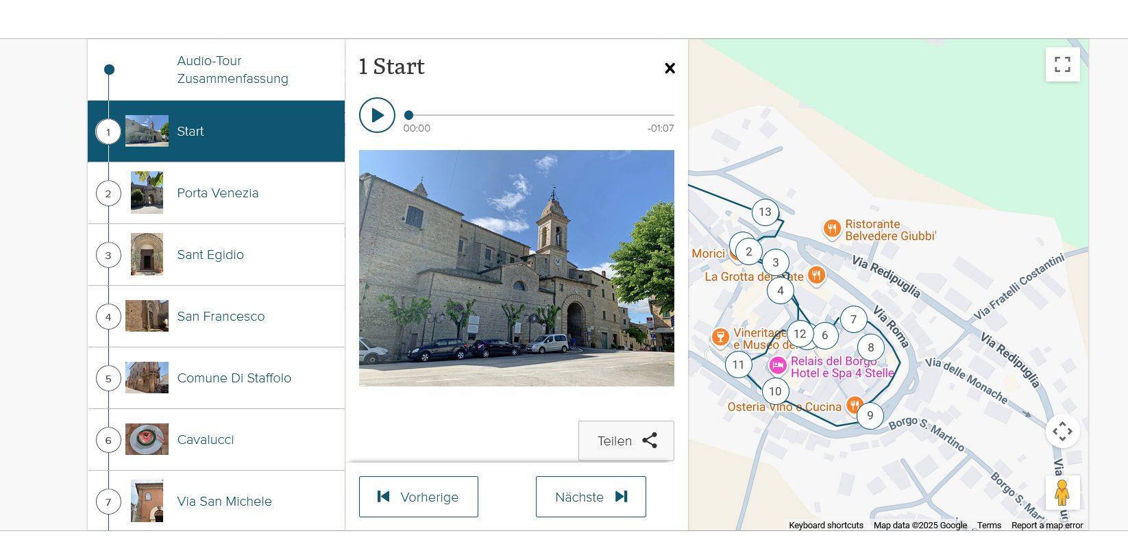 Auf dem Display erschienen daraufhin ein Stadtplan von Staffolo sowie die verschiedenen Stationen der Schnitzeljagd. Man klickt die Stationen nacheinander an, wobei eine Stimme eine Geschichte erzählt und erklärt, wie man laufen muss. Neben einigen Haltestellen steht „Mach das Quiz”. Dabei hört man eine Frage, die es zu beantworten gilt.