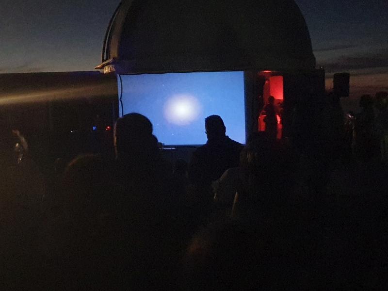 Die Sternwarte lag jetzt auch im Dunkeln, aber davor waren eine Leinwand und Stühle aufgebaut. Wir setzten uns und warteten, was nun kommen würde. Und warteten. Und warteten. Zunächst wurden auf der Leinwand verschiedenste Bilder von Sternen und Himmelsbildern gezeigt. Danach erläuterte uns ein Mitglied des Sternwarten-Clubs den Himmel: die Sternbilder, die wir sehen konnten, inklusive ihrer Namen und der Geschichte der Namensgeber. So bekamen wir gleichzeitig eine Einführung in griechische und römische Mythologie, von Kassiopeia bis Orion.