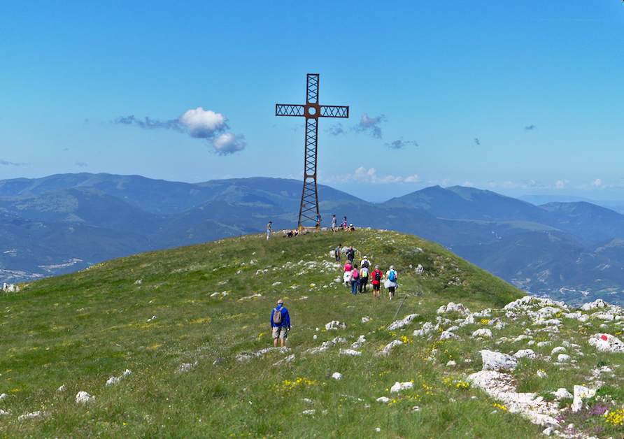 From the parking lot there are 550 meters of altitude, and the final part is just a short climb through the dunes to the top. From the highest point, where a metal cross proudly stands, you can benefit of a grandiose 360 degrees panorama: you can see the Adriatic Sea, the Monte Subasio in Umbria, the Monte Amiata of Tuscany, and even the Gran Sasso in the Abruzzo. You can bring your picnic basket and relax a little bit here.