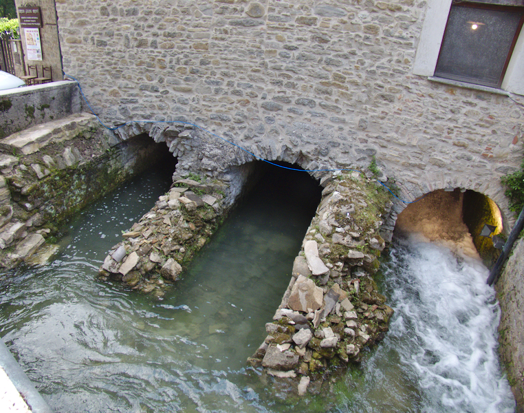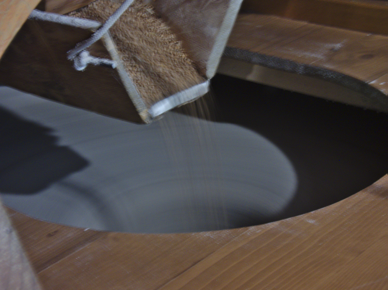 1200 litres of water per minute drive against the blade: the amount of water can be controlled manually in order to decide the speed of the rotating stones. With a lever they can control the different heights of the stones, each of 1,50 meters of diameters.