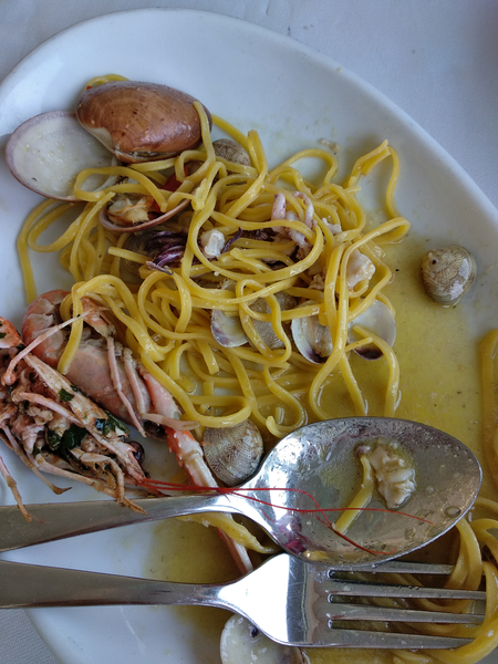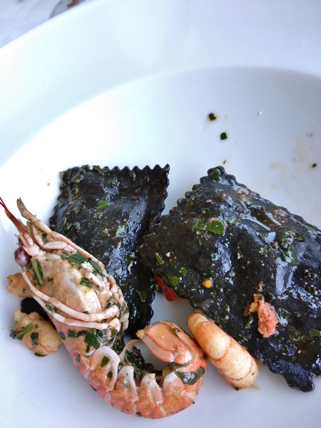 No interesting visit should end without eating in Le Marche. Indeed, the restaurant called La Vecchia Pesca (the old fishing catch) was there to help our rumbling stomachs. It was built in 1962 and rebuilt in 2016 after a big storm, and since the beginning the specialty was the seafood directly from the Adriatic Sea, of course! The cook tries to connect local traditions with flavors from other regions, and so we decided for the delicious raviolis with sepia ink filled with ricotta, and spaghettini with seafood.