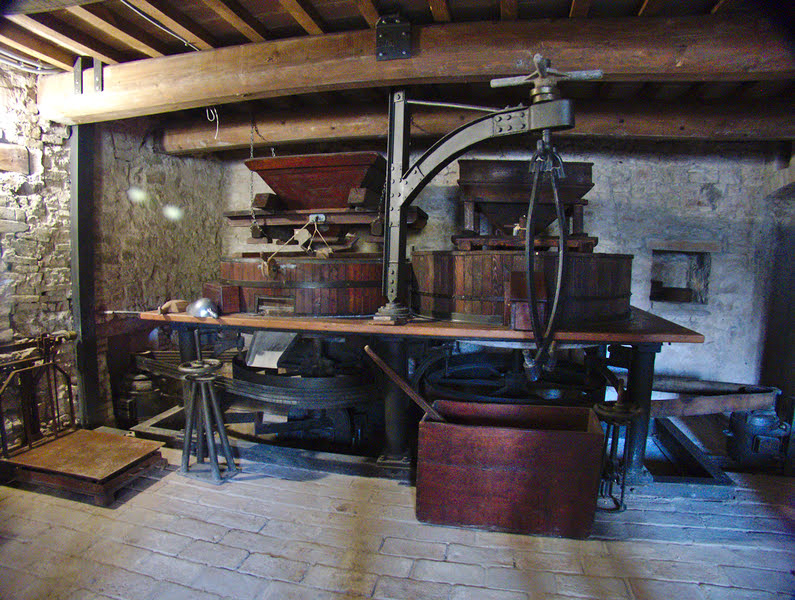 Before driving back to the centre, we should have a walk around the Church of Santa Maria. Not only the Church is very beautiful, but also the hidden mill next to it. You can spot it on the bridge on the way to the centre, and it is really worth a visit. The owner Gilberto is making a great effort in renewing the whole mill, and especially to make it work again! It is not only a mill that produces flour, but it is also capable of exploit water in order to activate a sawmill, to produce lime, to dye clothes, and to grind vines, nuts, corn and much more. The mill is open on request (contact Happennines).
