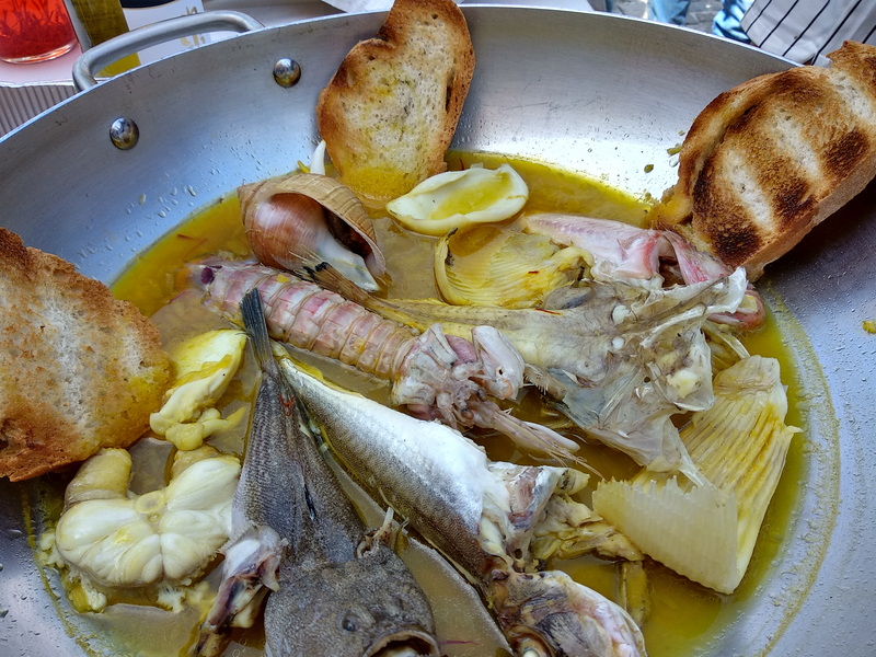 And now show time..or better, cooking show time! On Piazza del Borgo, two chefs from the Accademia del Brodetto. Brodetto is the traditional dish of the coast of our region. But every little villages has its own variety, and of course Porto Recanati is one of them. There are four major Marchigian resorts that claim to be the capital village of the brodetto: Ancona, San Benedetto, Fano and Porto Recanati. In Porto Recanati they add, unlike the others, no tomatoes or shellfish. Their special ingredient is the saffron glands dissolved in water. It used to be a too expensive element and is therefore often replaced by zafferanella or zafferanone (a wild Conero saffron) which gave the dish a yellowish color. The participants all diligently took pictures, saw the different preparations, but unfortunately couldn’t taste…better for me, because I started to become jealous 😉
